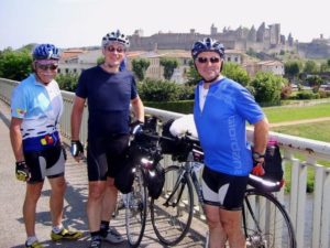 À la halte de Belpech, alors que nous pique-niquons, Bernard LESCUDÉ[2] vient à notre rencontre. Il nous donne des nouvelles de Michel LE CROM[3], pédaleur breton, septuagénaire obstiné, qu’il a accompagné à vélo le matin même.