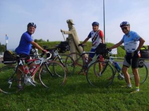 Sous la protection de la statue du pèlerin de Saint-Jacques-de-Compostelle, plantée sur le giratoire de Garris, nous posons pour immortaliser la rencontre.